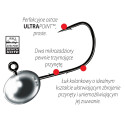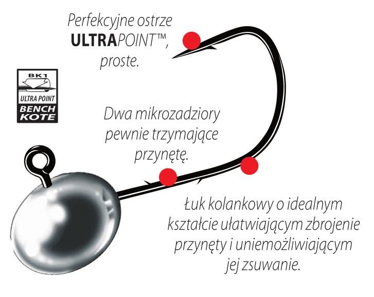 Niewielki haczyk z cienkiego, ale bardzo mocnego i sprężystego drutu oraz dwa mikroskopijne zadziory umieszczone po przeciwnych stronach trzonka haczyka, uniemożliwiające przynęcie zarówno zsuwanie się, jak i obracanie wokół osi haka. Ostrze ULTRAPOINTTM Micro jest maszynowo cięte, a następnie chemicznie ostrzone i dodatkowo utwardzane. Kropelkowe, lekko spłaszczone ołowiane dociążenie ustawiono w stosunku do trzonka haczyka tak, aby nawet najlżejsze szarpnięcie wywoływało natychmiastowy ruch małej przynęty.