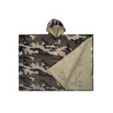 Wykonany jest z wodoodpornego, gumowanego materiału z klejonymi szwami i wzorem kamuflażu.