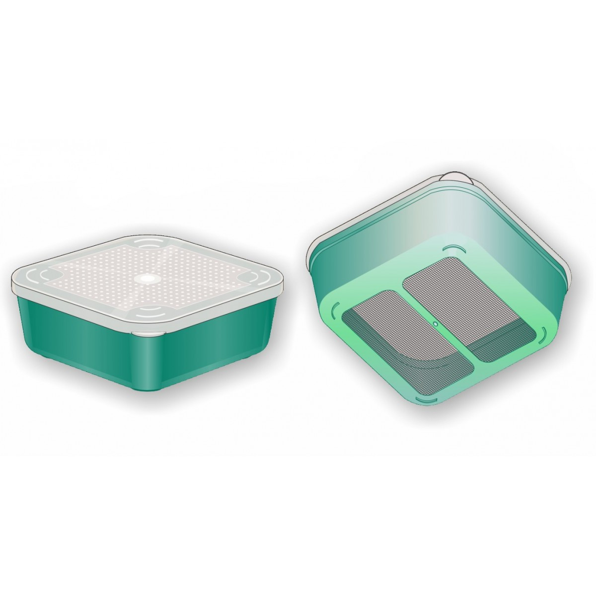 Siatkowe dno i dziurkowana pokrywka umożliwiają odsączanie lub przesiewanie przynęt.